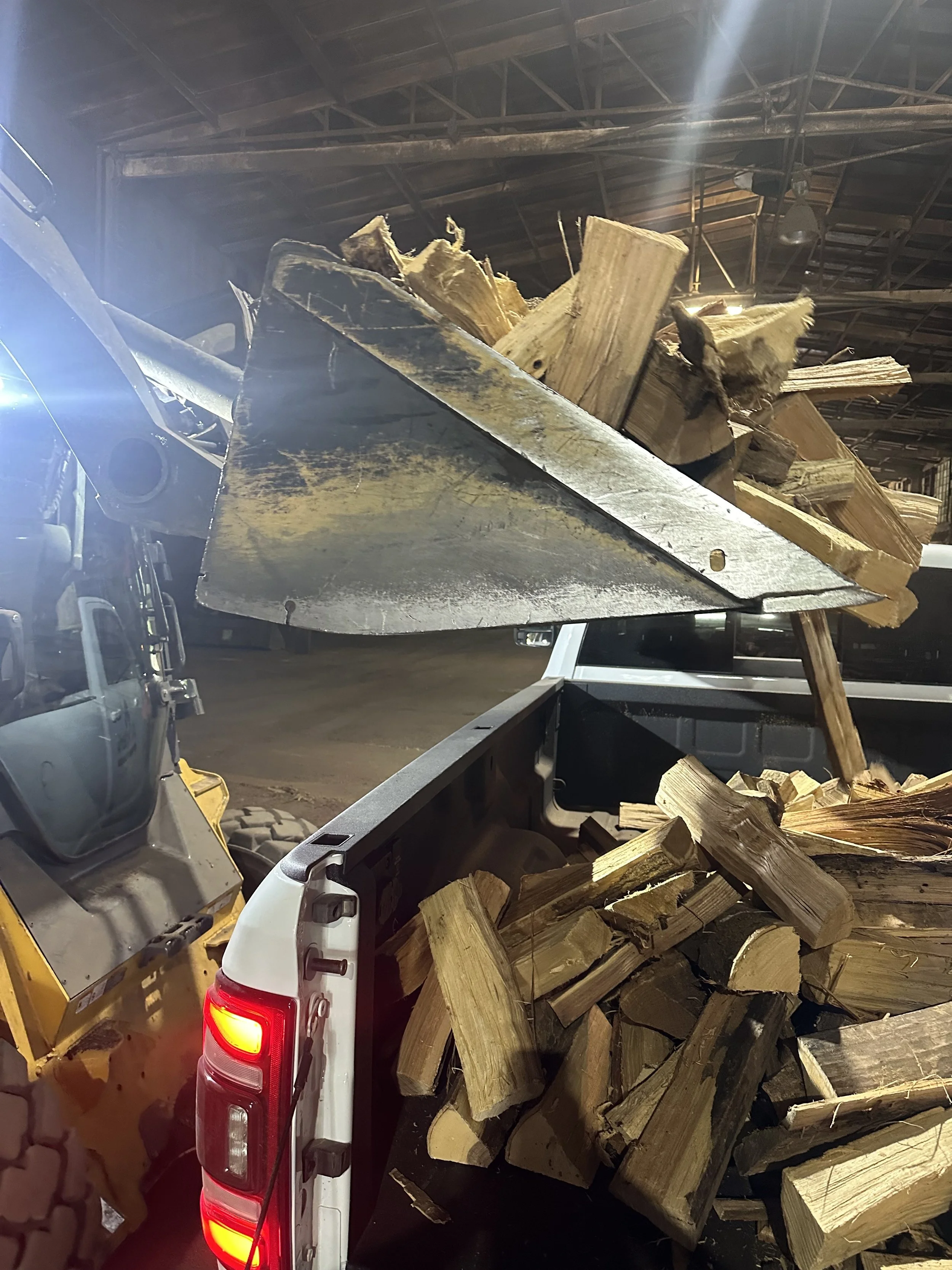 When Coming to our location in Camanche to get a truck load of Premium kiln dried firewood , we don’t waste any time. You simply pull into the wood barn and have your pick of wood. Using a skid steer we carefully load the back of the pick up truck or SUV. Each (scoop or bucket) you get is roughly 125 pieces of wood and is $40. A truck load of wood 2.5 scoops(face cord) and will fill up your vehicle.